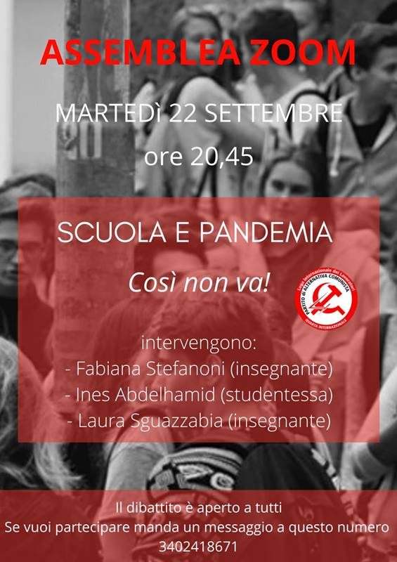 Aprire le scuole nel bel mezzo di un’epidemia non è una cosa da gestire come la stanno gestendo i governi borghesi di tutto il mondo, cioè con lo spirito del famoso motto “o la va o la spacca”. La posta in gioco è molto, troppo, alta. La chiusura delle scuole rappresenta, in questo sistema economico e sociale, un dramma per gli studenti, per tanti genitori e, soprattutto, per tante donne. La didattica a distanza non ha funzionato, è un dato di fatto: tanti studenti sono rimasti privati del diritto all’istruzione e tantissime donne, in questa società maschilista che fa ricadere solo su di loro il lavoro di cura, hanno vissuto mesi drammatici, con l’impossibilità di conciliare figli e lavoro. Ma è quanto meno irresponsabile l’atteggiamento di chi, come le grandi burocrazie sindacali, facendo leva su questo grande e reale disagio, ha additato la didattica a distanza come l'unico nemico, sottoscrivendo poi ignobili protocolli in-sicurezza per le riaperture. Aprire le scuole in queste condizioni per evitare la didattica a distanza è un po’ come tagliarsi la testa per evitare l'emicrania. Abbiamo già spiegato in dettaglio, in altri articoli, quale dovrebbe essere a nostro avviso un piano di riapertura delle scuole compatibile con la sopravvivenza e la salute delle masse (1). Si tratta di un piano che presuppone un radicale cambiamento economico, politico e sociale, cioè un cambio di sistema. Un sistema economico basato sul profitto, che ha come obiettivo esclusivo la vendita delle merci e che lascia nella miseria larghe masse, non potrà garantire nessuna tutela della salute, così come non potrà garantire la sopravvivenza del pianeta. Oggi più che mai è necessario porre all’ordine del giorno l’esproprio della proprietà privata dei mezzi di produzione, la costruzione di un’economia pianificata e collettiva che abbia come principale obiettivo la difesa della salute, dell’istruzione e dell’ambiente. Non si tratta di obiettivi per un futuro imprecisato: vanno fatti vivere già oggi nelle lotte che dobbiamo costruire.